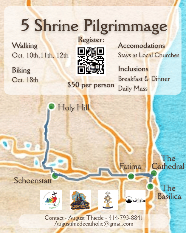 Pilgrimage of Hope - Join us for a pilgrimage to the 5 shrines dedicated by the Archdiocese of Milwaukee for the 2025 Jubilee Year of Hope. There will be a walking pilgrimage on October 10th, 11th, and 12th, or a biking pilgrimage on October 18th. Cost is $50 for the walking pilgrimage, but reach out if you need help covering this. The bike pilgrimage cost is TBD based on responses, but will be less than $50. Click here to register.