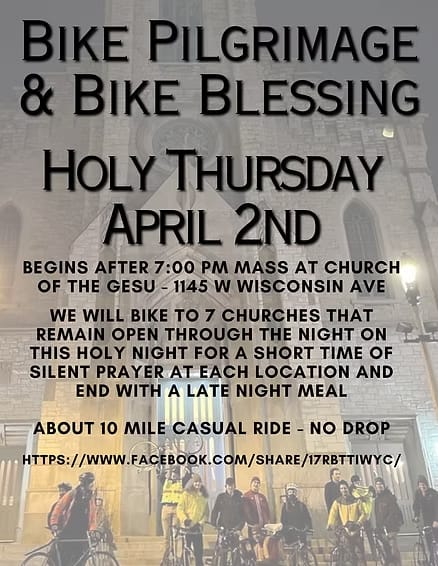 Join us for the yearly Holy Thursday Bike Pilgrimage & Bike Blessing! We will bike to 7 churches that remain open throughout the night on this holy night. We will have a short time of silent prayer at each location and will end with a late night meal at the St. Brigid Center (2133 W Wisconsin Ave). About 10-mile casual ride - no drop. This year, we will have several extra bike wheels, so in case of a flat we can do a quick swap of the wheel and can make any fixes at the stops to keep things moving, after there were 3 flats last year.